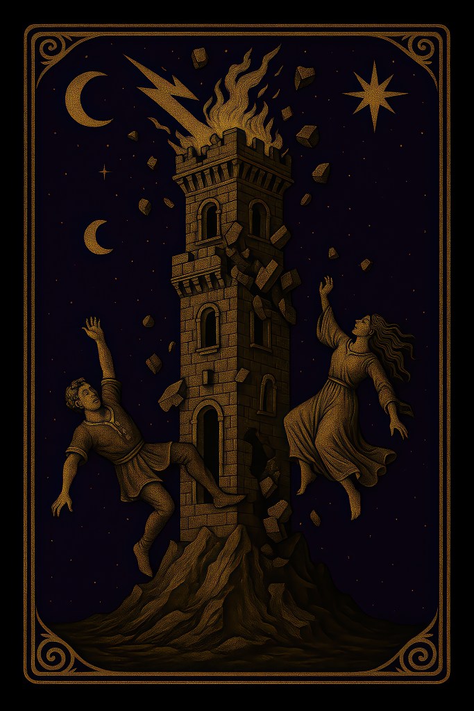 In Tarot, the card best representing times like this is The Tower. It’s a scary card depicting a large medieval tower crumbling after a surprise lightning strike as people jump from it’s windows. It is a card of destruction and sudden change. It’s also a card of learning, realignment and emancipation IF one can seize on the opportunities it presents.